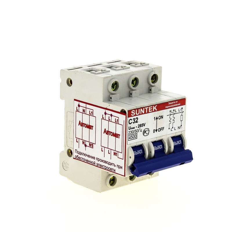 SUNTEK-C – трехмодульный автоматический выключатель с установкой на DIN-рейку. Первые два модуля выполнены как автоматические выключатели, которые срабатывают от токов короткого замыкания. В третьем модуле встроенный блок контроля и выключения. Устанавливается на вводе эл. энергии. При трехфазном питании устанавливаются на каждую фазу.