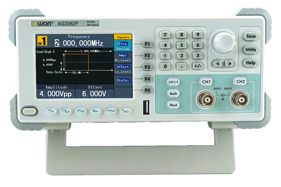 OWON AG2052F представляет собой многофункциональный генератор-частотомер, объединивший в одном приборе функциональный генератор и генератор сигналов произвольной формы.