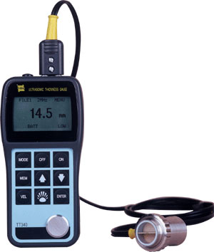 Ультразвуковой толщиномер TT 340 применяется для измерения толщины различных изделий из металлов и неметаллов, а также отливок с возможностью отображения текущего и минимального значения толщины (выбираемого в программном меню), встроенной памятью на 500 измерений, отображением результатов в миллиметрах или дюймах, индикацией степени разрядки источника питания, регулируемой яркостью подсветки ЖК-дисплея.